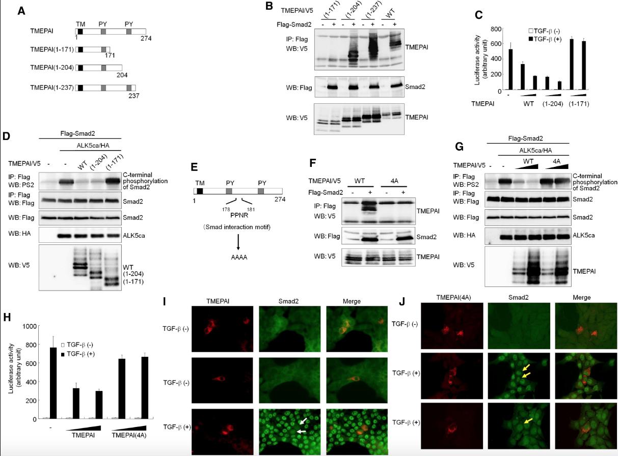 Figure 3. Determination of Functional Domain in TMEPAI (A) Schematic presentation of deletion mutants for mouse TMEPAI. TM, transmembrane domain; PY, PY motif. (B) Interaction of TMEPAI mutants with Smad2. COS7 cells were transfected with indicated plasmids and harvested for coIP experiments. (C) Effect of TMEPAI mutants on TGF-β-induced reporter activity. Different doses of TMEPAI or its mutants were cotransfected with (CAGA)12-luc in HepG2 cells with or without 5 ng/ml TGF-β for 18 hr. (D) Effect of TMEPAI mutants on ALK5ca-induced Smad2 phosphorylation. Experiments were performed according to Figure 1B. (E) Schematic presentation of TMEPAI(4A) mutant. (F) Interaction of TMEPAI(4A) mutant with Smad2. COS7 cells were transfected with indicated plasmids and harvested for coIP experiments. (G) Effect of TMEPAI(4A) mutant on ALK5ca-induced Smad2 phosphorylation. Experiments were performed according to Figure 1B. (H) TMEPAI(4A) does not inhibit TGF-β-induced reporter activity. Experiments were performed according to Figure 3C. (I and J) TMEPAI, but not TMEPAI(4A), blocks nuclear translocation of Smad2 upon TGF-β stimulation. NMuMG cells were transfected with (I) TMEPAI or (J) TMEPAI(4A), stimulated with 5 ng/ml TGF-β for 1 hr, and fixed for immunofluorescence. Ectopic TMEPAI and endogenous Smad2 were visualized with red and green, respectively. White arrows indicate TMEPAI-expressing cells in which Smad2 did not translocate into the nucleus upon TGF-β stimulation. Yellow arrows indicate TMEPAI(4A)-expressing cells in which Smad2 could translocate into the nucleus upon TGF-β stimulation. |
