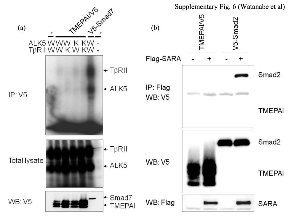 Figure S6. TMEPAI Interacts with Neither TGF-β Receptors nor SARA (a) Smad7, but not TMEPAI interacts with TGF-β receptors. COS7 cells were transfected with indicated plasmids. Affinity cross-linking using 125I-TGF-β was performed, and then complexes of either TMEPAI or Smad7 with receptors were immunoprecipitated with anti-V5 antibody. W; wild-type, K; kinase-dead. (b) Smad2, but not TMEPAI interacts with SARA. COS7 cells were transfected with indicated plasmids and harvested for Co-IP experiments. V5-Smad2 was used as a positive control. |