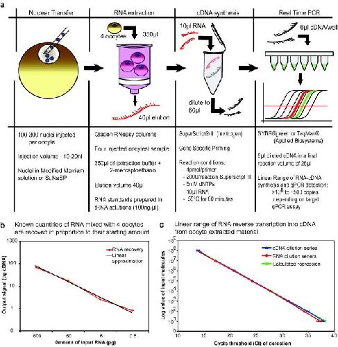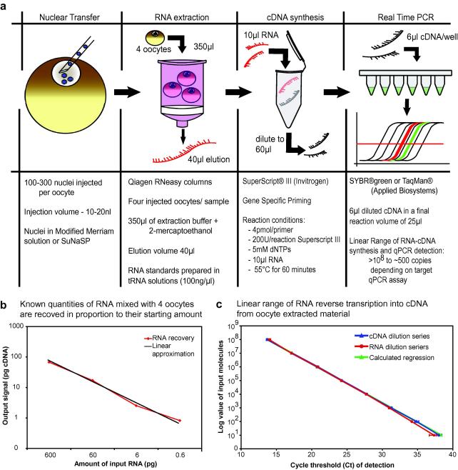 Fig. 4. Schematic diagram of optimized RNA extraction, reverse transcription and qPCR, illustrating the conditions used for detecting transcripts following a nuclear transplant experiment (a). RNA is shown in red and cDNA in black. Critical parameters and output ranges are shown in the notes below the figures. Starting RNA quantities of a typical experimental series can be recovered from oocyte material in linearly proportional amounts following RNA extraction (b). Conversion of RNA to cDNA is linear across different input RNA amounts in an oocyte RNA background (c).
