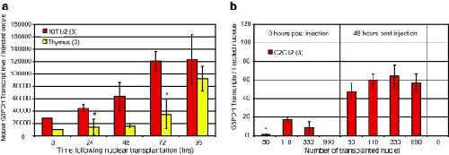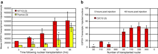 Fig. 6. Accumulation of G3PDH transcripts over 4 days from oocytes injected with 10T1/2 or Thymus nuclei (a). Expression of G3PDH per injected C2C12 nucleus from different numbers of nuclei injected into Xenopus oocytes and maintained at 16 °C for 48 h (b). P < 0.02, except samples marked ∗P < 0.1, n = 3 (except first time point in A, where n = 1), error bars are mean SD.
