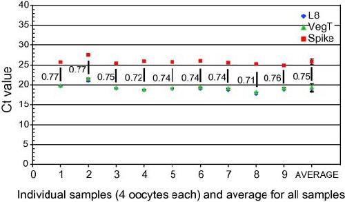 Fig. 7. Real Time PCR Ct values for L8, VegT and an RNA “spike” gene for nine samples of four oocytes each. Numbers adjacent to bars indicate the ratio of the ‘spike’ Ct to mean L8 and VegT Ct values.