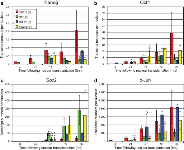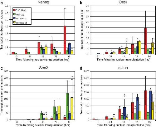 Fig. 8. Transcription of Nanog (a), Oct4 (b), Sox2 (c) and c-Jun (d) initiates and increases over time following nuclear transplantation into the oocyte GV for each of the four donor nuclei types examined (see key). Samples were frozen at the indicated time points following transplantation in batches of 4 oocytes and examined for transcription of the genes by qRT-PCR. Error bars represent standard deviation of mean biological replicates (n is indicated in brackets for each cell-type in the key). Δ indicates one or more replicates discarded due to GV mis-targetting for that sample group. P < 0.5, unless marked ∗0.1 > P > 0.05 or ∗∗P > 0.1.