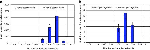 Fig. 5. Reprogramming signal strength and efficiency are optimal between 100 and 300 nuclei. Transcription of Sox2 from different numbers of C2C12 nuclei injected into Xenopus oocytes and maintained at 16 °C for 48 h (a). Efficiency (absolute number of transcripts/transplanted nucleus) of Sox2 reactivation from different numbers of C2C12 nuclei injected into Xenopus oocytes and cultured at 16 °C for 48 h (b). P < 0.02, error bars are mean SD.