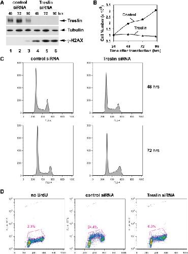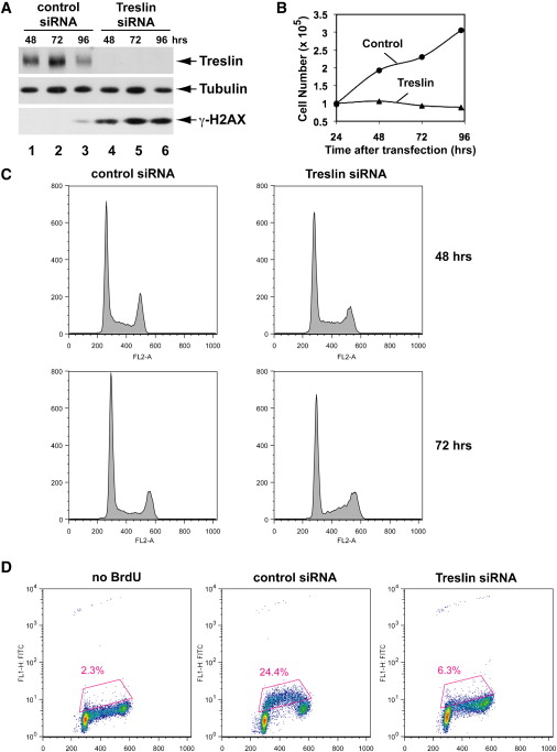 Figure 5. Depletion of Treslin from Human Cells Results in Defective S Phase (A) Human U2OS cells were treated with control siRNA (lanes 1â3) or Treslin siRNA #1 (lanes 4â6) for 48, 72, and 96 hr. Cell lysates were immunoblotted for Treslin, α-tubulin, and γ-H2AX. (B) Cell numbers in control and Treslin siRNA-treated cultures were counted at indicated times after transfection. (C) DNA content of cells treated with siRNA was analyzed by flow cytometry. Cells were stained with propidium iodide. DNA content is shown on the x axis. The y axis indicates the relative number of cells. (D) Cells treated with control or Treslin siRNA were incubated in the absence or presence of BrdU for 60 min at 72 hr after transfection. Intensity of BrdU incorporation is indicated on the logarithmic y axis; DNA content is shown on the x axis. The boxed area indicates cells incorporating BrdU. See also Figure S4. |