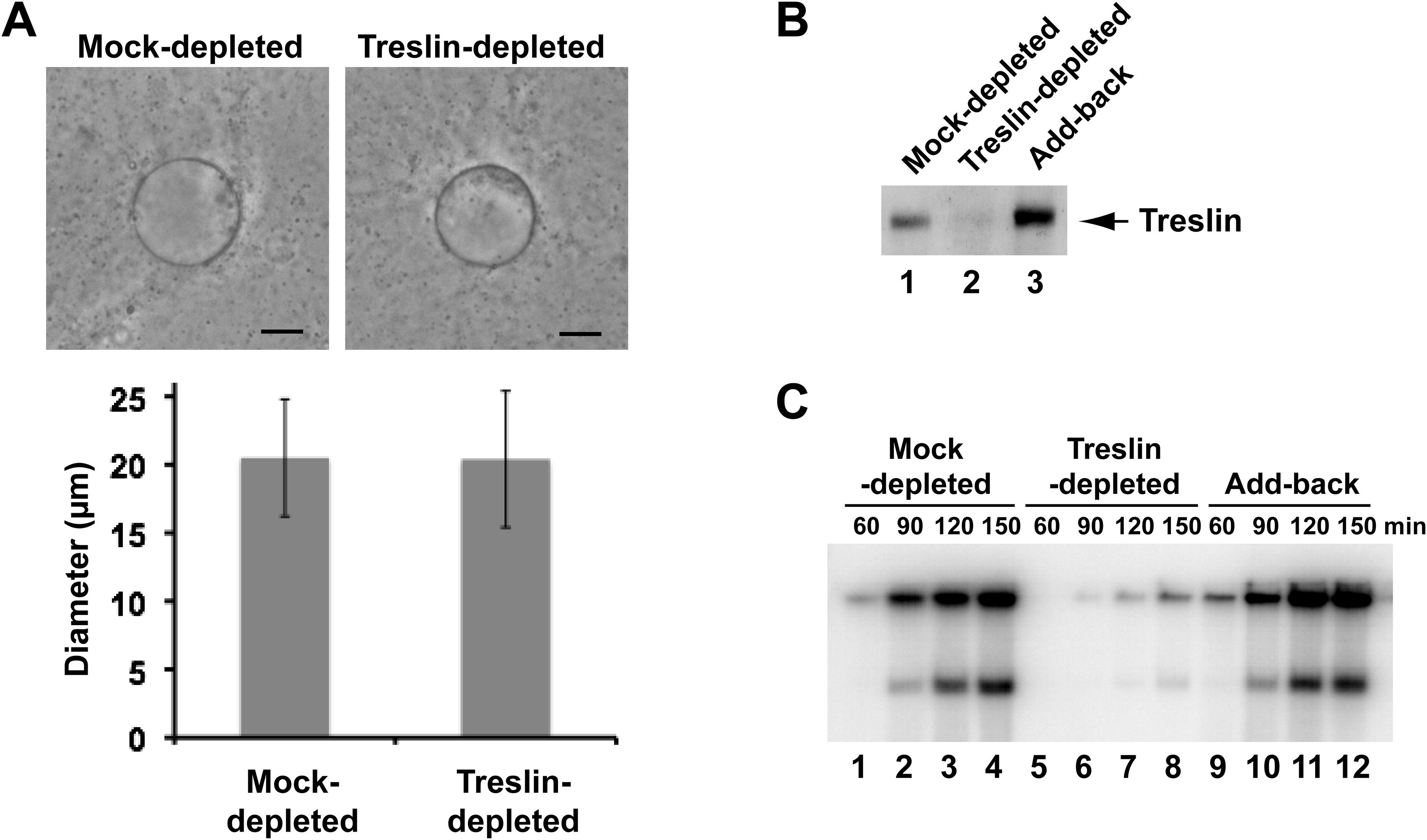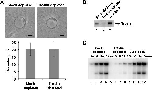 Figure S2. Immunodepletion of Treslin Does Not Irreversibly Compromise the Functional Integrity of Egg Extracts—Related to Figure 3 (A) Nuclei in mock-depleted and Treslin-depleted extracts were visualized at 90 min by phase-contrast microscopy (top). Scale bar indicates 10 μm. Nuclear diameter (mean ± standard deviation) was determined using the ImageJ program (bottom). More than 100 nuclei were measured in each sample in two independent experiments. (B) Mock-depleted (lane 1), Treslin-depleted (lane 2), and Treslin-depleted extracts that had been supplemented with salt extracts of replicating nuclei (lane 3) were immunoblotted for Treslin. (C) The extracts from panel B were assayed for chromosomal DNA replication at indicated times. As expected, the salt extract from replicating nuclei was incapable of DNA replication by itself (data not shown). |