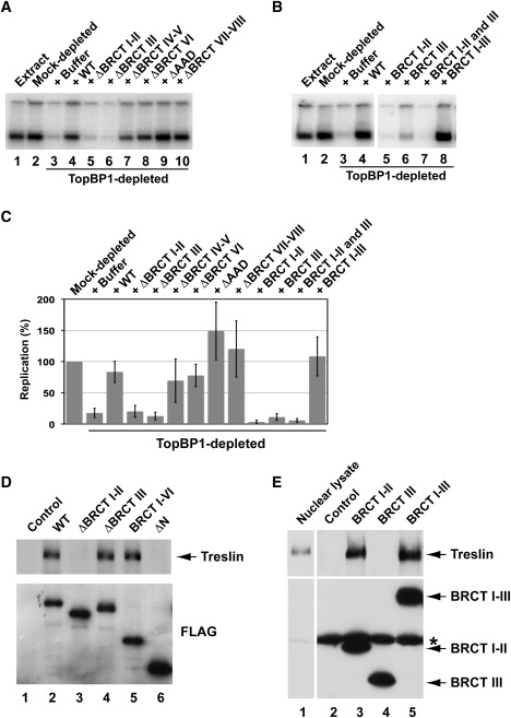 Figure 2. Treslin Interacts with a Region of TopBP1 that Is Essential for DNA Replication (A) Regions of TopBP1 necessary for DNA replication. Egg extracts (lane 1) were mock depleted with control antibodies (lane 2) or immunodepleted with anti-TopBP1 antibodies (lanes 3â10). TopBP1-depleted extracts were supplemented with no recombinant protein (lane 3), full-length (WT) HF-TopBP1 (lane 4), or deletion mutants of TopBP1 lacking the indicated BRCT domains or the ATR-activating domain (AAD) (lanes 5â10). DNA replication was determined by incorporation of 32P into chromosomal DNA after 120 min. Labeling of both the upper and lower bands was quantitated. (B) Egg extracts (lane 1) were subjected to mock depletion (lane 2) or immunodepletion of TopBP1 (lanes 3â8). TopBP1-depleted extracts were supplemented with no recombinant protein (lane 3), full-length HF-TopBP1 (lane 4), or fragments containing BRCT domains I-II (lane 5), III (lane 6), or I-III (lane 8). For lane 7, two fragments containing domains I-II or III were added together. (C) Quantitation of the data from (A) and (B). Results were compiled from seven independent experiments. Values are from at least two independent experiments (mean ± standard deviation). Replication in mock-depleted extracts is denoted as 100%. (D) Nuclear lysates from egg extracts containing no tagged protein (lane 1) or the indicated versions of HF-TopBP1 (lanes 2â6) were immunoprecipitated with anti-FLAG beads. Samples were processed for immunoblotting with anti-Treslin (top) and anti-FLAG antibodies (bottom). (E) Nuclear lysates (lane 1) from egg extracts containing no tagged protein (lane 2) or the indicated fragments of TopBP1 (lanes 3â5) were incubated with anti-FLAG beads. Beads were retrieved and immunoblotted with anti-Treslin (top) and anti-FLAG antibodies (bottom). Asterisk denotes cross-reacting IgG heavy chain. See also Figure S1. |