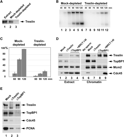 Figure 3. Treslin Is Required for Chromosomal DNA Replication in Xenopus Egg Extracts (A) Egg extracts (lane 1) were mock depleted with control antibodies (lane 2) or immunodepleted with anti-Treslin antibodies (lane 3) and immunoblotted for Treslin. (B) Mock-depleted (lanes 1â6) and Treslin-depleted (lanes 7â12) extracts were assayed for chromosomal DNA replication at the indicated times. (C) Compilation of results (mean ± standard deviation) from four independent experiments on the extent of replication in mock-depleted (left) and Treslin-depleted (right) extracts at the indicated times. Replication at 120 min in mock-depleted extracts is denoted as 100%. (D) Mock-depleted extracts (lanes 1, 5, and 6), Treslin-depleted extracts (lanes 2 and 7), TopBP1-depleted extracts (lanes 3 and 8), and TopBP1-depleted extracts supplemented with HF-TopBP1(I-III) (lanes 4 and 9) were incubated for 90 min in the absence (lane 5) or presence (lanes 6â9) of sperm nuclei. Extracts (lanes 1â4) and chromatin fractions (lanes 5â9) were immunoblotted for the indicated proteins. (E) Chromatin fractions from mock-depleted (lane 1), Treslin-depleted (lane 2), and TopBP1-depleted (lane 3) extracts were immunoblotted for the indicated proteins. See also Figure S2. |