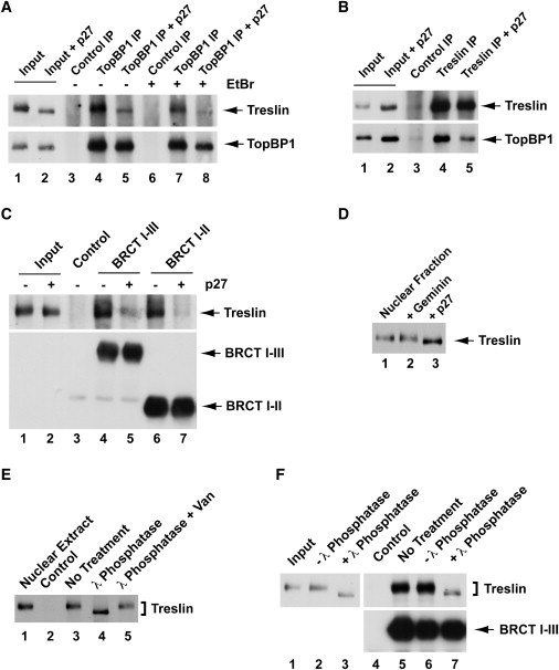 Figure 4. Association of Treslin with TopBP1 Depends Upon Cdk2 (A) Nuclear lysates were prepared from egg extracts incubated without (lanes 1, 3, 4, 6, and 7) or with p27 (lanes 2, 5, and 8). Input lysates (lanes 1 and 2), control immunoprecipitates (lanes 3 and 6), and anti-TopBP1 immunoprecipitates (lanes 4, 5, 7, and 8) were immunoblotted for Treslin and TopBP1. Immunoprecipitations were carried out in the absence (lanes 3â5) or presence of 50 μg/ml ethidium bromide (EtBr) (lanes 6â8). (B) Nuclear lysates were prepared from egg extracts incubated without (lanes 1, 3, and 4) or with p27 (lanes 2 and 5). Input lysates (lanes 1 and 2), control immunoprecipitates (lanes 3), and anti-Treslin immunoprecipitates (lanes 4 and 5) were immunoblotted for Treslin and TopBP1. (C) Nuclear lysates from egg extracts lacking (lanes 1, 3, 4, and 6) or containing p27 (lanes 2, 5, and 7) were incubated with anti-FLAG antibody beads containing no tagged protein (lane 3) or the indicated fragments of TopBP1 (lanes 4â7). Beads were retrieved and immunoblotted with anti-Treslin and anti-FLAG antibodies. Lanes 1 and 2 depict input nuclear lysates. (D) Nuclear fractions were prepared from extracts that were mock treated (lane 1) or treated with geminin (lane 2) or p27 (lane 3). Samples were immunoblotted for Treslin. (E) Nuclear lysates (lane 1) containing no tagged protein (lane 2) or the HF-TopBP1(I-III) fragment (lanes 3â5) were incubated with anti-FLAG beads. Beads were retrieved and incubated without (lanes 2 and 3) or with 20 U/μl lambda phosphatase (lanes 4 and 5) in the absence (lane 4) or presence of 10 mM sodium vanadate (lane 5) for 30 min at room temperature. Vanadate is an inhibitor of lambda phosphatase. Samples were immunoblotted for Treslin. (F) Eluates of chromatin treated with 0.45 M NaCl (lane 1) were incubated in the absence (lanes 2 and 6) or presence of lambda phosphatase (lanes 3 and 7) for 30 min at room temperature or left on ice (lanes 4 and 5). Subsequently, eluates were mixed with anti-FLAG beads in the absence (lane 4) or presence of HF-TopBP1(I-III) (lanes 5â7). Beads were retrieved and immunoblotted with anti-Treslin (top) or anti-FLAG antibodies (bottom). See also Figure S3. |