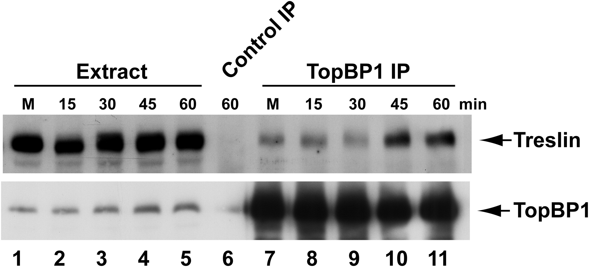 Figure S3. Time-Course for Binding of Treslin and TopBP1—Related to Figure 4 M-phase extracts (lanes 1 and 7) and interphase extracts containing sperm nuclei (lanes 2-6 and 8-11) were incubated for the indicated times after activation with calcium. Extracts were diluted with buffer to a final concentration of 0.5% NP-40 and 0.4 M NaCl to dissolve nuclear membranes and release Treslin and TopBP1 from chromatin. Samples were then diluted and immunoprecipitated with control (lane 6) or anti-TopBP1 antibodies (lanes 7-11). Extracts and immunoprecipitates were immunoblotted for Treslin and TopBP1. |