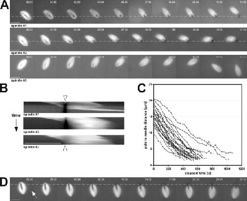 Figure 2. Intrinsic spindle forces move impaling microneedles through the spindle. (A) Images shown were selected from three time-lapse series of skewered spindles. Dashed lines indicate the position of the microneedle, which remained essentially stationary during the experimental time course. (B) Kymographs were used to analyze velocities of spindles as they translocated off microneedles. Because skewered spindles often rotated during time-lapse experiments as the result of changing flows within the extract (e.g., spindle #3), each image in the series was rotated using custom software to maintain a fixed orientation of the spindle’s interpolar axis (arrowheads mark the position of the needle). (C) The distance between the nearest pole and the middle of the needle was plotted versus time. Slopes were calculated using linear regressions from these plots of pole to needle distances of >5 µm and those equal to 5 µm. (D) Two microneedles were used to impale spindles. In each case, the needles were positioned on the same side of the spindle midzone, and the spindle moved off both needles, regardless of the predominant direction of extract flow (indicated by the white arrow). Dashed lines indicate the position of the microneedles used to skewer the spindles. Bars, 25 µm.