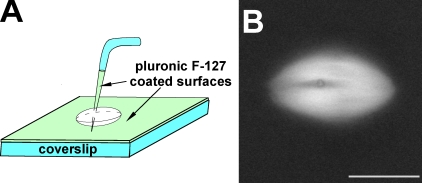 Figure 1. Experimental approach for spindle skewering. (A) The cartoon shows the experimental setup used in all skewering experiments (see Materials and methods for more details). (B) Example of a skewered spindle visualized by the addition of X-rhodamine–labeled tubulin to the extract. The cross section of the microneedle is seen as a dark annulus. Bar, 25 µm.