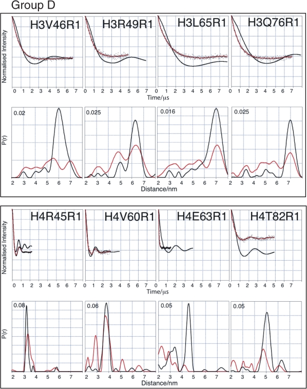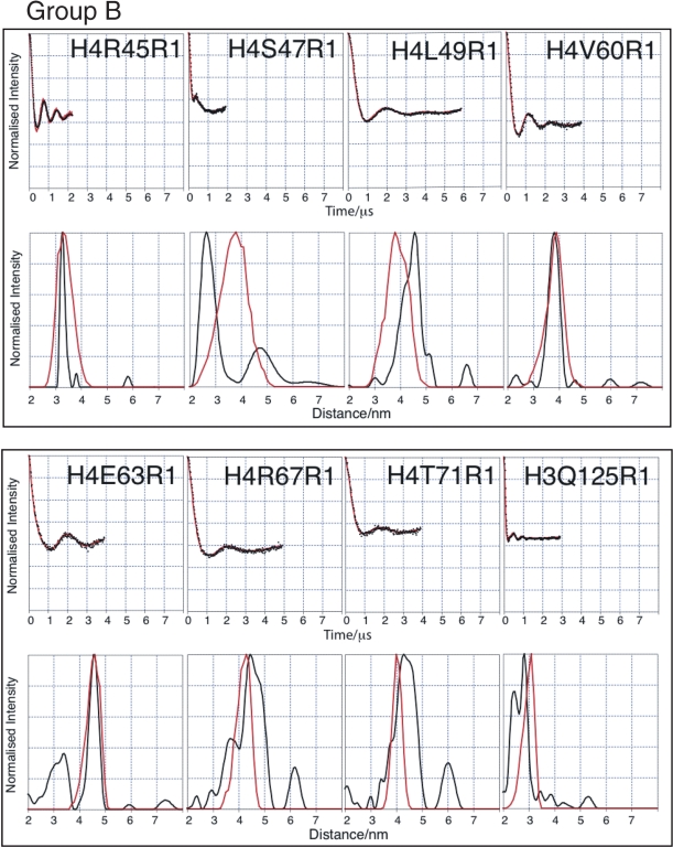 Figure 3. PELDOR data from the histone octamer for Group B. Results derived from label positions <4 nm apart based on predicted Cα-Cα distance. For each mutant two graphs of data are shown. Top graphs: Background corrected echo oscillations (black), Tikhonov fit (red). Bottom graphs: Tikhonov regularization-derived distance distributions (black), simulated distributions (red).