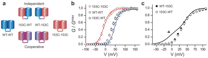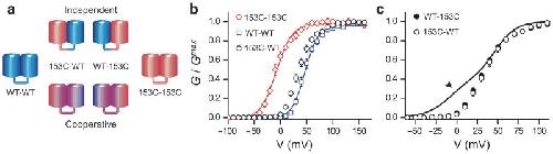 Figure 2. Cooperative gating in Hv1 linked dimers made of 153C and WT subunits. (a) Cartoon representing the possible scenarios for subunit cooperativity in Hv1 linked dimers. Subunits with different colors have different activation properties. Purple shading indicates an influence of one subunit on the other. (b) Voltage dependence of proton conductances of the linked 153C–153C and WT-WT homodimers, compared to the voltage dependence of linked 153C-WT heterodimers. See Table 1 for Boltzmann fits. (c) Comparison between voltage dependence of the linked 153C-WT and WT-153C heterodimers and the prediction for the independent opening of the two pores (continuous line). pHi = pHo = 6.0. Error bars are s.e.m., n = 4–6.