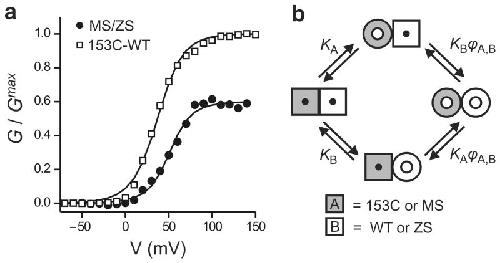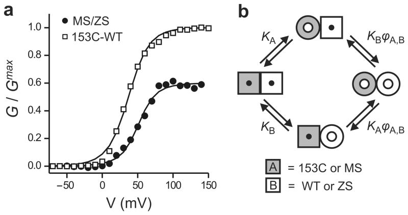 Figure 4. Quantification of cooperativity in Hv1. (a) Voltage dependence of activation of the MS/ZS heterodimer and the 153C-WT linked dimer fitted with the opening model shown in b. For MS/ZS Hv1: ϕMS,MS = ϕMS,ZS = ϕZS,ZS = 60 ± 35, for153C-WT Hv1: ϕ153C,153C = ϕWT,WT = 95, ϕ153C,WT = 23 ± 2. See text for details. (b) Model of opening of the two pores of Hv1. Cooperativity is quantified by the parameter ϕ, which is the ratio between the open probability of a given subunit when the neighboring subunit is in the open conformation and the open probability of the same subunit when the neighboring subunit is in the closed conformation. ϕ > 1 means that the opening of one pore makes it easier for the other pore to open (positive cooperativity). The scheme represents the case of a heterodimer made of subunit A (gray) and subunit B (white) with different voltage dependencies of activation (KA and KB). Subunit A can be 153C or MS, and subunit B can be WT or ZS. The transition from square shape to round shape represents the conformational change associated with opening (see also Supplementary Fig.4).