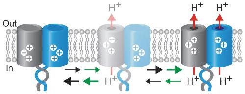 Figure 6. Proposed basic gating mechanism for the Hv1 channel. Opening of one subunit favors the opening of the neighboring subunit. As a result, the two subunits tend to be in the same state, either both closed or both open. With a cooperativity factor ϕ = 60 the total fraction of channels with only one open pore can never be higher than 12%. The represented states are connected by at least two transitions: a voltage sensing transition (black arrows) responsible for the fast component of sensor movement detected by VCF, and an opening transition (green arrows). Based on the similarity between the VSD of Hv1 and the VSDs of other voltage-gated channels, the voltage-sensing process is represented as upward movement of charges (shown in white). The C-termini of the two subunits are shown as coiled-coil.