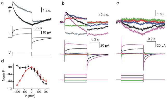 Figure 5. Hv1 voltage-sensor coupling detected by voltage-clamp fluorometry. (a) Voltage sensor movement detected on Hv1 195C labeled with TAMRA-MTS. Changes in fluorescence (F) and proton current (I) were produced by the indicated voltage step (V) from −80 mV to +160 mV. Traces in gray were recorded at pHo 7.4. Traces in black were recorded from the same oocyte in acetate buffer at pHo 6.3, which also acidifies the internal solution (see text). (b–c) Comparison between voltage sensor movement in labeled 195C/195C homodimers and 195C/218S heterodimers. Heterodimers were produced by co-expressing the Hv1 195C subunit with an excess of the 218S subunit. Fluorescence changes and proton currents were elicited by voltage steps from −200 to +200 mV in 80 mV increments. Holding potential was −80 mV, pHo was 6.3. (d) Normalized F-Vs from labeled oocytes expressing the Hv1 195C subunit (red circles) or co-expressing the 195C and 218S subunits (black squares). Fluorescence was measured at the end of the 500-ms long test-pulse (voltage protocol and recording conditions as in b–c. Each point is the average of 5 measurements ± s.e.m.