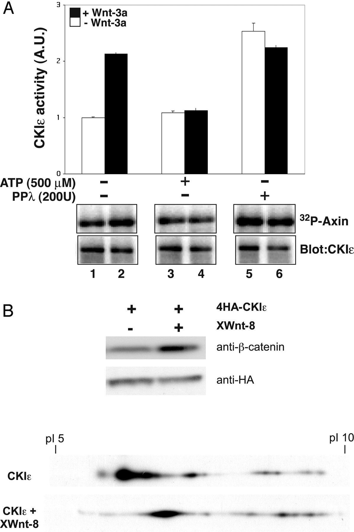 The Wnt/beta-catenin signaling pathway is important in both development and cancer. Casein kinase Iepsilon (CKIepsilon) is a positive regulator of the canonical Wnt pathway. CKIepsilon itself can be regulated in vitro by inhibitory autophosphorylation, and recent data suggest that in vivo kinase activity can be regulated by extracellular stimuli. We show here that the phosphorylation state and kinase activity of CKIepsilon are directly regulated by Wnt signaling. Coexpression of XWnt-8 or addition of soluble Wnt-3a ligand led to a significant and rapid increase in the activity of endogenous CKIepsilon. The increase in CKIepsilon activity is the result of decreased inhibitory autophosphorylation because it is abolished by preincubation of immunoprecipitated kinase with ATP. Furthermore, mutation of CKIepsilon inhibitory autophosphorylation sites creates a kinase termed CKIepsilon(MM2) that is significantly more active than CKIepsilon and is not activated further upon Wnt stimulation. Autoinhibition of CKIepsilon is biologically relevant because CKIepsilon(MM2) is more effective than CKIepsilon at activating transcription from a Lef1-dependent promoter. Finally, CKIepsilon(MM2) expression in Xenopus embryos induces both axis duplication and additional developmental abnormalities. The data suggest that Wnt signaling activates CKIepsilon by causing transient dephosphorylation of critical inhibitory sites present in the carboxyl-terminal domain of the kinase. Activation of the Wnt pathway may therefore stimulate a cellular phosphatase to dephosphorylate and activate CKIepsilon