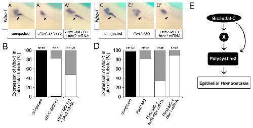 Fig. 4. Bicc1 is epistatic to Pkd2. (A-Aâ²) Analysis of the expression of nbc-1 in the Xenopus late distal tubule at stage 39 by whole-mount in situ hybridization of uninjected control embryos, and embryos radially injected with xBicC-MO1+2 in the presence or absence of a single injection of 2 ng pkd2 mRNA. (B) Quantification of the expression of nbc-1 in the late distal tubule from the experiments shown in A-Aâ². Black, bilateral expression; white, no expression; gray, unilateral expression rescued by co-injected mRNA. The number of embryos analyzed is indicated. (C-D) Reciprocal experiments to those in A-B using Xenopus embryos injected with either Pkd2-MO alone or together with pkd2-myc or bicc1 mRNA. Co-injection with pkd2-myc rescued nbc-1 expression, whereas co-injection with bicc1 did not. (E) Flow diagram outlining the proposed mechanism of Bicc1 activity.