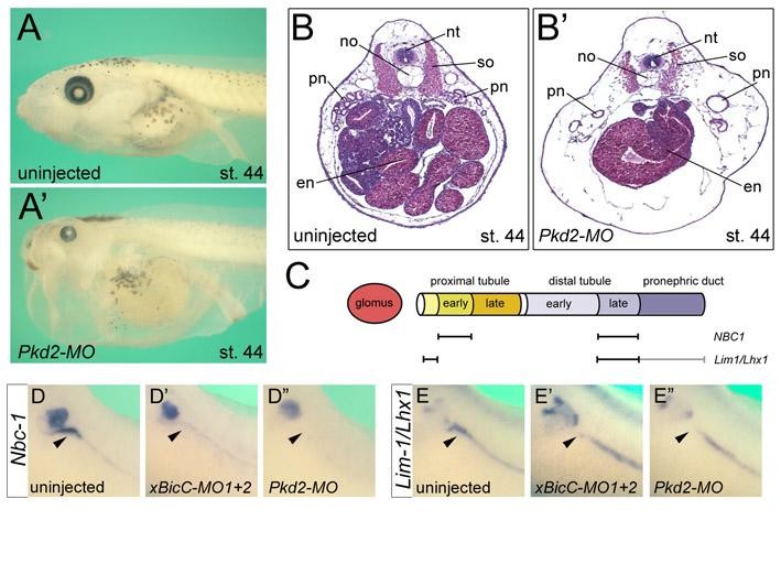 Fig. S6. Loss of Pkd2 results in a PKD-like phenotype in Xenopus embryos. (A-Bâ²) Xenopus embryos microinjected with antisense MOs against pkd2 (Pkd2-MO) developed a PKD-like phenotype. Morphological analysis showed severe edema formation (A,Aâ²), while histological analysis using Hematoxylin and Eosin staining detected dilated pronephric tubules (B,Bâ²). en, endoderm; no, notochord; nt, neural tube; pn, pronephros; so, somites, (C) Schematic of the Xenopus pronephros indicating the segments expressing the marker genes nbc-1 and lim1 (lhx1). (D-Eâ²â²) Whole-mount in situ hybridization of Xenopus embryos injected with xBicC-MO1+2, Pkd2-MO or uninjected controls at stage 39 with nbc-1 (D-Dâ²â²) and Lim1 (E-Eâ²â²). Arrowheads indicate the expression of these two genes in the late distal tubule that is lost in the antisense MO-injected embryos.