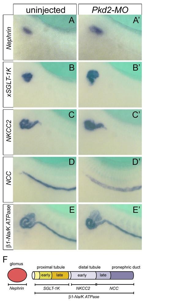 Fig. S7. Expression of pronephric marker genes in pkd2 morphants. (A-E′) Whole-mount in situ hybridization of uninjected control and Pkd2-MO-injected Xenopus embryos at stage 39 with Nephrin (A,A′), xSGLT-1K (B,B′), NKCC2 (C,C′), NCC (D,D′) and β1-Na/K ATPase (E,E′) mRNA. Note that the expression of NCC, a marker for late distal tubule and pronephric duct, was reduced in Pkd2-MO-injected embryos. (F) Schematic of the Xenopus pronephros indicating the markers analyzed.
