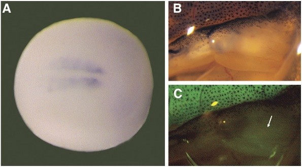Fig. 7 . Onset of XMRF4a transgene expression. (A) In situ hybridization showing GFP expression under control of the 610-bp promoter in the early somites of an F1 individual at stage 18-20, dorsal view, anterior to the right. (B) Reflected-light image of the righthindlimb of a stage-56 F1 animal carrying the 1.1-kb promoter construct. (C) GFP fluorescence from the same limb as in (B). Note that the developing muscle (arrow) in the limb shows much lower intensity of fluorescence than do the tailmyotomes at the top of the figure.