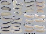 Fig. 5. Activity of the rat MRF4 minimal promoter in transgenic X. laevis embryos. In situ hybridization shows GFP expression in representative positive individuals, oriented with dorsal side towards the top of the figure, anterior towards the left.