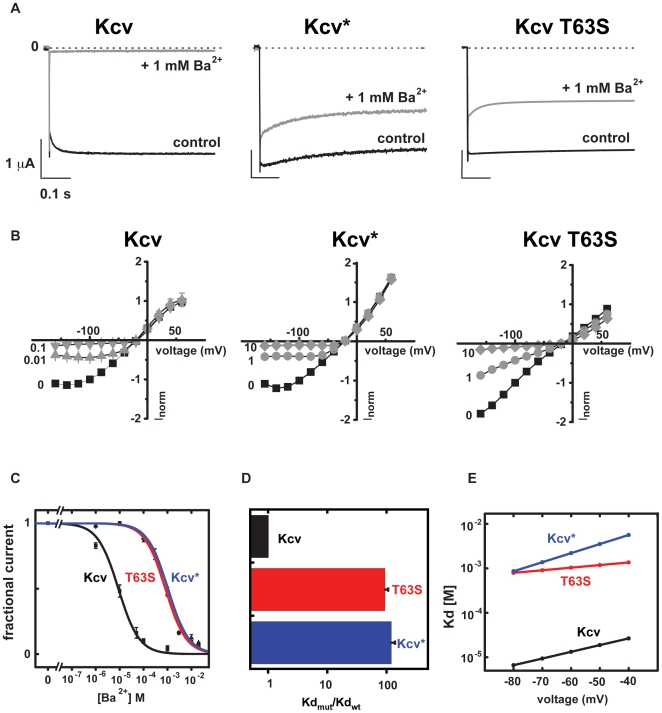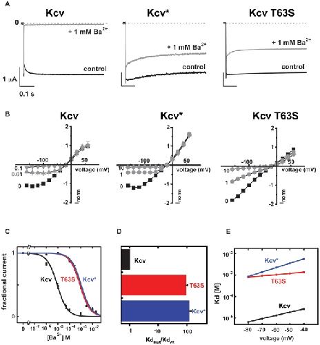 Figure 3. Functional characterization of Kcv mutants.A, Two electrode voltage clamp recording of Kcv, Kcv*, and Kcv T63S in 50 mM external KCl (control) and external KCl with 1 mM Ba2+. Test voltage is −60 mV from a holding potential of −20 mV. B, Current-voltage relations for Kcv, Kcv*, and Kcv T63S in the presence of different concentrations of external barium. Currents are normalized to the value at −100 mV for the barium-free solution. External barium concentrations (in mM) are indicated next to each I-V curve. C, Comparison of the relative barium affinities for Kcv (black), Kcv* (blue), and Kcv T63S (red) at −80 mV. Lines indicate fits to the Hill equation If = Kdn/(Kdn+[Ba2+]n). D, Comparison of the relative barium dissociation constants at −80 mV. E, Voltage dependence of steady-state barium block. Lines show fits to the Woodhull equation [63]. Kd(V) = Kd(0)exp(zFδ/RT x V), Kd(0) and δ values are: 0.09±0.48 mM, 28.0±0.9 mM, and 2.3±0.2 mM; δ = 0.33±0.04, 0.53±0.02 and 0.17±0.02 for Kcv, Kcv*, and T63S, respectively. Errors are s.d. |
