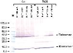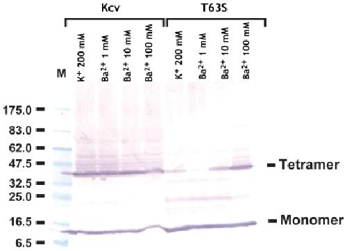 Figure 6. Stability analysis of Kcv and Kcv T63S.Western blot of microsomal membranes containing Kcv or Kcv T63S following treatment with the indicated concentrations of K+ or Ba2+ prior to loading onto an SDS gel. Positions of the tetramer and monomer forms, and the size of the molecular weight markers are indicated. Additional band in T63S is assigned as the dimer. Channels bear an N-terminal His9 tag and were detected using an anti-polyhistidine antibody (see Material and Methods). |