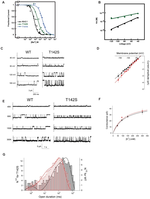 Figure 7. Kir2.1 T142S functional analysis.A, Comparison of the barium Kds for Kir2.1, Kir2.1 T142S (green), and Kir2.1 T141K (blue, data from [9]) B, Woodhull comparison for Kir2.1 and Kir2.1 T142S (green). Lines show fits to the Woodhull equation [63]. Kd(V) = Kd(0)exp(zFδ/RT x V). Kd(0) values are: 131±3 µM and 172±22 µM; δ = 0.56±0.02 and 0.22±0.02 for Kir2.1 and Kir2.1 T142S, respectively. C, Representative current traces of Kir2.1 and Kir2.1 T142S in 90 mM KCl. D, Plot of single channel amplitudes versus membrane potential. E, Single channel current traces for Kir2.1 and Kir2.1 T142S as a function of potassium concentration. F, Single channel conductance as a function of [K+]. Fits are to the Michelis-Menten equation and yielded values of Km = 123 mM, 120 mM, and γmax = 48.5 pS and 51.3 pS for Kir2.1 and Kir2.1-T142S, respectively. G, Gating kinetics analysis of Kir2.1 (black) and Kir2.1-T142s (red). Mean open times Kir2.1 298.7±292.2 ms (n = 416) and Kir2.1-T142S 93.4±92.6 ms (n = 1890). Intraburst probability was not changed (0.84±0.041 n = 8, 0.88±0.042 n = 8, Kir2.1 and Kir2.1-T142S, respectively). Errors are s.d. |