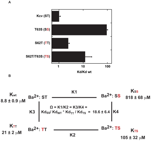 Figure 8. Coupling between Kcv residues 62 and 63 influences barium block.A, Comparison of the relative barium dissociation constants at −80 mV for Kcv, T63S, S62T, and S62T/T63S mutants. Brackets show the two positions under investigation. Red indicates the sites of the mutation. B, Double mutant cycle analysis [42], [43] shows that the changes at positions 62 and 63 are coupled. Ω = 1 for mutations that are energetically independent. Errors are s.d. |