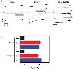 Figure 5. Functional characterization of amantadine sensitivity.A, Current traces at +40 mV and −140 mV in the absence (black) and presence (grey) of 10 mM amantadine for Kcv, Kcv*, and Kcv T63S. B, Comparison of the relative amantadine dissociation constants at +40 mV (2±0.2, wt; 22.4±1.4 Kcv*, 20.5±1.7 T63S) and −140 mV (0.8±0.1, wt; 6.9±0.9 Kcv*, 11.8±0.7 T63S). Errors are s.d. |