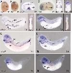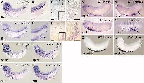 Figure 3. Forced expression of ETV2 in the Xenopus embryos results in ectopic expression of endothelial and myeloid marker genes. A-D: Control embryo, injected with enhanced green fluorescent protein (EGFP) mRNA and assayed for flk1 transcripts. A,B: View of whole embryo (A), and enlarged view (B) of ventral posterior region of embryo showing near absence of endothelial (flk1-expressing) cells. C,D: Transverse section through embryo (C) and enlarged view (D), showing absence of flk1 marker expression in posterior of embryo. E-H: Embryo injected with etv2 mRNA and assayed for flk1 expression. E,F: View of whole embryo (E) and enlarged view (F), showing high levels of ectopic flk1 transcript. G,H: Transverse section through embryo (G) and enlarged view (H), showing large domains of ectopic flk1 transcripts. Scale bar in both G and H = 100 microns. I,J: Control embryo, and embryo injected with etv2 mRNA, assayed for aplnr expression. I: View of embryo injected with EGFP mRNA. J: View of embryo expressing ETV2 and showing ectopic aplnr transcripts. K,L: Control embryo (K) and embryo injected with etv2 mRNA (L), assayed for erg expression. K: View of embryo injected with EGFP mRNA. L: View of embryo expressing ETV2 and showing ectopic erg transcripts. For etv2 mRNA-injected embryos shown in E,J,L, in addition to ectopic marker expression, note the disruption of the normal patterning of endothelial structures, relative to controls. M,N: Control embryo (M) and embryo injected with etv2 mRNA (N), assayed for runx1 expression. M: View of embryo injected with EGFP mRNA. N: View of embryo expressing ETV2 and showing ectopic expression of runx1. In N, in addition to ectopic expression, note reduced expression and altered distribution of endogenous runx1. O,P: Control embryo (O) and embryo injected with etv2 mRNA (P), assayed for spib expression. O: View of embryo injected with EGFP mRNA. P: View of embryo expressing ETV2 and showing ectopic expression of spib. Q,R: Control embryo and embryo injected with etv2 mRNA, assayed for alpha -globin expression. Q: Control embryo injected with EGFP mRNA. R: Whole embryo expressing ETV2, showing no appreciable difference in expression of alpha -globin transcripts. In all panels, arrows indicate regions of ectopic marker expression. |