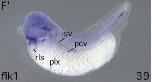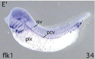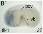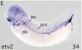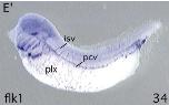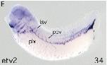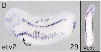 Figure 2. etv2 is expressed in hematopoietic and endothelial precursor cells in the Xenopus embryo. A-F prime : Transcripts of etv2 (A-F) and flk1 (A prime -F prime ) were detected by in situ hybridization. flk1 is an established marker of the hematopoietic and endothelial lineages. Developmental stage of the embryos is indicated at the lower right of each panel. Embryos shown in A,A prime ,C,C prime , and insets in D,D prime are ventral views. All other views are lateral with anterior to the left. vbi, ventral blood island; pcv, posterior cardinal vein; plx, vascular plexus; isv, intersegmental vessel; rls, rostral lymphatic sac. |