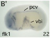 kdr (kinase insert domain receptor (a type III receptor tyrosine kinase) gene expression in Xenopus laevis embryo, assayed via in situ hybridization, NF stage 22, lateral view, anterior left, dorsal up. |
