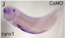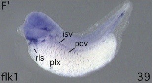 kdr (kinase insert domain receptor (a type III receptor tyrosine kinase) gene expression in Xenopus laevis embryo, assayed via in situ hybridization, NF stage 39, lateral view, anterior left, dorsal up. |