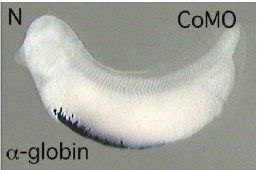 hba1 (alpha-globin) gene expression in Xenopus laevis embryo, assayed via in situ hybridization, NF stage 33 7 34, lateral view, anterior left, dorsal up. |