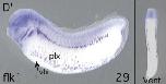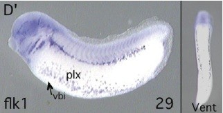 kdr (kinase insert domain receptor (a type III receptor tyrosine kinase) gene expression in Xenopus laevis embryo, assayed via in situ hybridization, NF stage 29, lateral view, anterior left, dorsal up. |