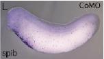 spib (Spi-B transcription factor (Spi-1/PU.1 related)) gene expression in Xenopus laevis embryo, assayed via in situ hybridization, NF stage 28, lateral view, anterior left, dorsal up. |