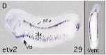 etv2 (ets variant 2) > gene expression in Xenopus laevis embryo, assayed via in situ hybridization, NF stage 39, lateral view, anterior left, dorsal up. |
