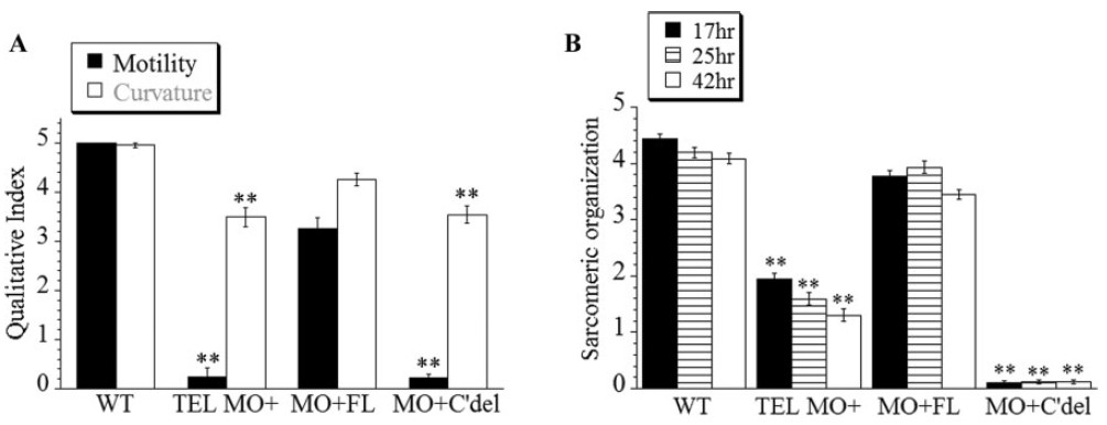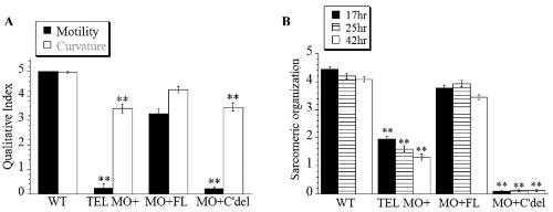 in morphology and motility after FL rescue compared to TEL MO� and MO�C�del. B: Sarcomere