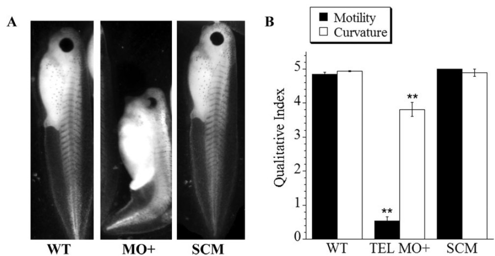 tail curvature in TEL MO� embryos compared to WTand SCM embryos (**P < 0.001). |