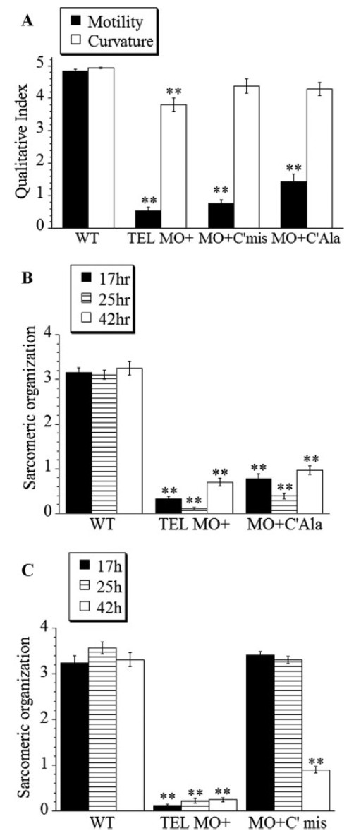 decrease in motility in TEL MO�, MO�C�Ala, and MO�C�mis embryos compared to WT
