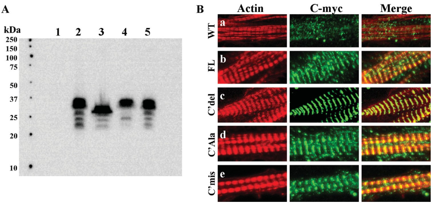 Fig. 10. Myc-telethonin fusion proteins express and localize to the Z-disc. A: Western data for