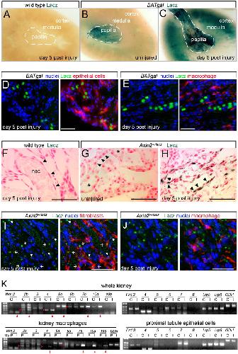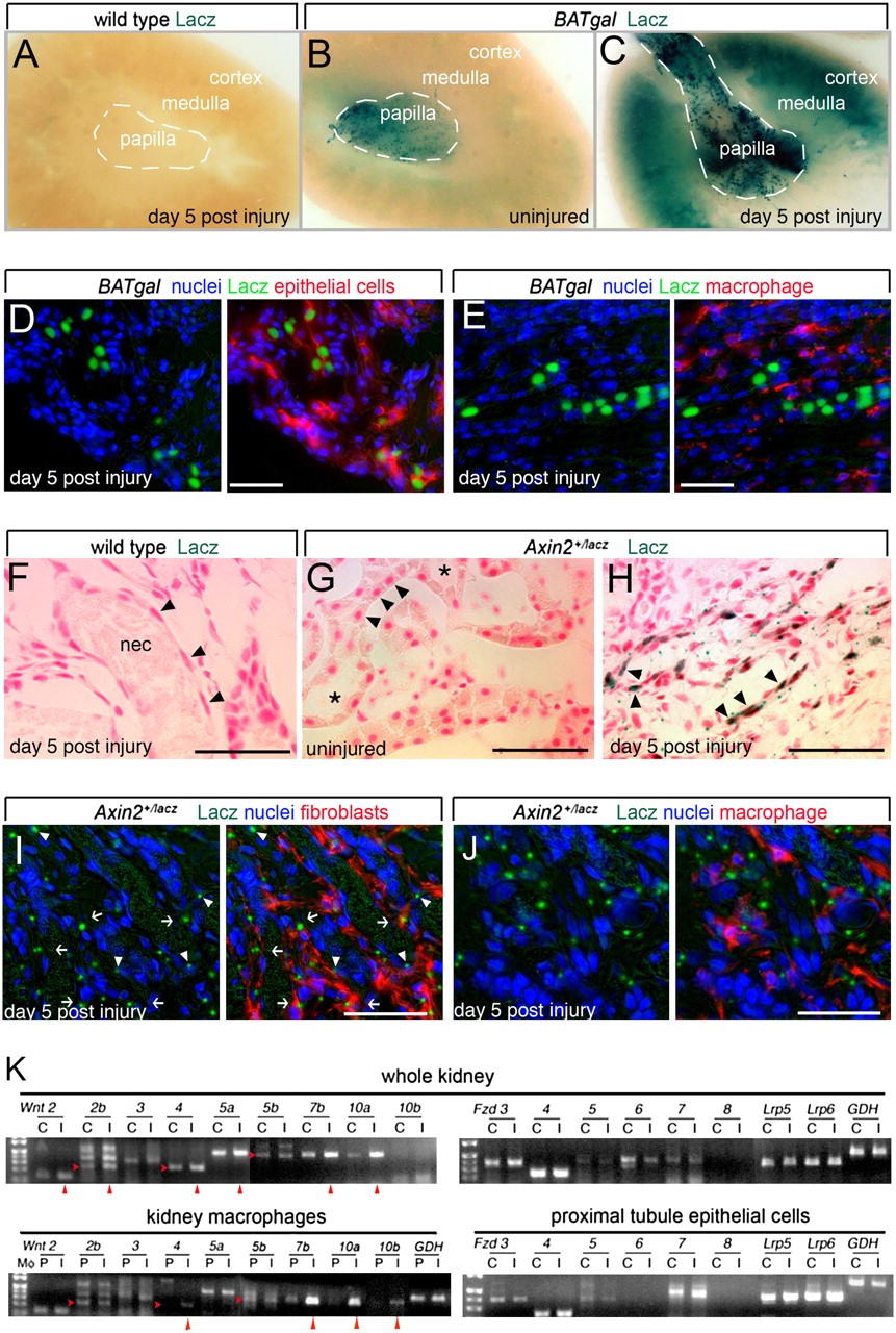 Fig. 1. Injured proximal tubule epithelial cells are Wnt-pathway-responsive, and inflammatory macrophages are a source of Wnt ligands in the kidney during repair following injury. (AâC) Photomicrographs of whole-mount X-gal-stained BATgal kidneys indicating Wnt pathway responses. (D and E) Sections from day 5 injured kidneys from BATgal mice labeled for nuclei (blue), Lacz (green), the proximal epithelial tubule marker LTL (D), or the macrophage marker F4/80 (E). Epithelial cells but not macrophages are Lacz-positive. (FâH) X-gal staining for Wnt signaling activity in Axin2+/LacZ kidneys. In F, arrowheads indicate epithelial cells of flattened morphology typical of severe injury that contrasts with cuboidal morphology shown by arrowheads in uninjured kidney (G). Injured tubules contain necrotic debris (F, nec), whereas uninjured tubules do not (G, asterisks). X-gal staining is prominent in epithelial cells of Axin2+/LacZ kidneys (H and I, arrowheads). (I and J) Sections from day 5 injured kidneys from Axin2+/LacZ mice labeled for nuclei (blue), Lacz (green), the fibroblast marker α-SMA (I), or the macrophage marker F4/80 (J). In I, Lacz-positive fibroblasts are seen (arrows). (K) Semiquantitative RT-PCR for transcript levels of Wnt-signaling-pathway ligands and receptors in whole kidney or purified cell types (C, normal control; I, d5 postinjury; P, peripheral blood monocytes). Red arrowheads indicate up-regulated transcripts. All studies were repeated at least three times and gave comparable results. *P < 0.05. (Scale bars, 50 μm.)