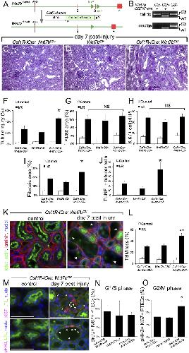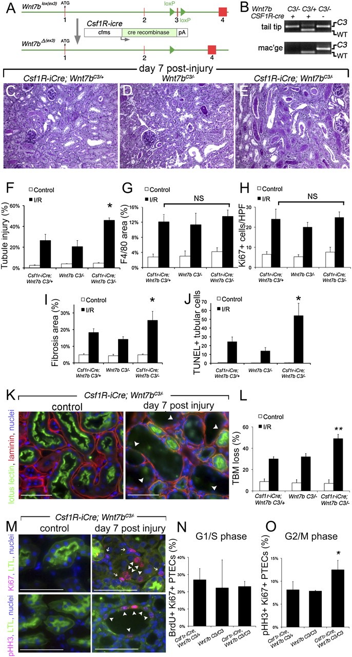 Fig. 4. Somatic mutation of Wnt7b in macrophages prevents normal repair and regeneration of the kidney following ischemia reperfusion injury. (A and B) Genomic map and PCR products (tail or macrophage genomic DNA) showing the third exon of Wnt7b is deleted in monocytes/macrophages of mice with the LoxP-flanked conditional allele Wnt7bC3 and the transgene Csf1r-icre. WT allele, 153 bp; C3 allele, 200 bp; δC3 allele, no product. (CâE) PAS-stained sections of the outer cortex of Csf1R-icre; Wnt7bC3/â kidneys or control kidneys (Csf1R-icre; Wnt7bC3/+ and Wnt7bC3/â) 7d following injury. (FâJ) Quantification of inflammation, injury, and repair parameters 7d postinjury of Csf1R-icre; Wnt7bC3/â or control mice (Csf1R-icre; Wnt7bC3/+ and Wnt7bC3/â). (K and L) Immunofluorescence images of kidneys showing dissolution of epithelial basement membrane (arrowheads) and quantification of dissolution in control and experimental (Csf1R-icre; Wnt7bC3/â) mice. (MâO) Immunofluorescence images of experimental postinjury kidneys showing the presence of markers of the cell cycle in epithelial cells and quantification of epithelial cells entering G1/S or in G2M phase of the cell cycle. P < 0.05. n = 5 or 6/group. (Scale bars, 50 μm.)