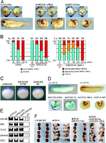 Figure 1. MARCKS is essential for gastrulation movements. (A) Both 500 pg of MARCKS mRNA and 5 pmol of MARCKS Mo impaired gastrulation movements, when either was injected into the dorsal marginal region. (B) Statistical data of the gastrulation-defective phenotype caused by MARCKS mRNA and Mo. (C) Expression of chordin at the gastrula stage, detected by in situ hybridization. (D) Somites (left) and notochord (right) were immunostained with 12/101 and MZ15 antibodies, respectively. (E) 5 pmol of MARCKS Mo was injected into the two dorsal blastomeres at the four-cell stage; the DMZ explants were isolated, and the expression of mesodermal markers was detected by RT-PCR. gsc, goosecoid. (F) 2 pmol of MARCKS Mo inhibited the activin mRNA-induced elongation of animal caps. This inhibition was rescued by coinjection of 200 pg of MARCKS mRNA.
