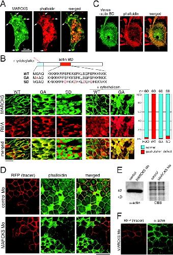 Figure 3. MARCKS regulates cortical actin formation. (A) Cells expressing 200 pg of MARCKS-Venus mRNA were dissociated from DMZ explants and plated on a FN-coated cover glass. Arrows indicate protrusions where both MARCKS and F-actin were enriched. (B) Wild-type, GA, and SD mutants were expressed in the DMZ explants and observed. RMA, RFP fused with the actin-binding domain of moesin. The explants were treated with 200 μM of cytochalasin B for 30 min. Bar, 50 μm. The graph shows percentages of the gastrulation-defective phenotype. (C) The actin-binding domain of Xenopus moesin was fused with Venus (Venus-actin BD) and expressed in CHO cells. (D) Mo was injected into one blastomere of two-cell embryo with mb-RFP mRNA as a tracer. Animal cap explants were fixed and stained with phalloidin. Bar, 50 μm. (E) Western blot with an antiactin antibody (left) and Coomassie Blue (CBB) staining (right). Mo was injected into both of the blastomeres of two-cell embryos. Lysates were prepared from the animal caps. (F) MARCKS Mo and mb-RFP were coinjected and animal cap cells were immunostained with antiactin antibody.