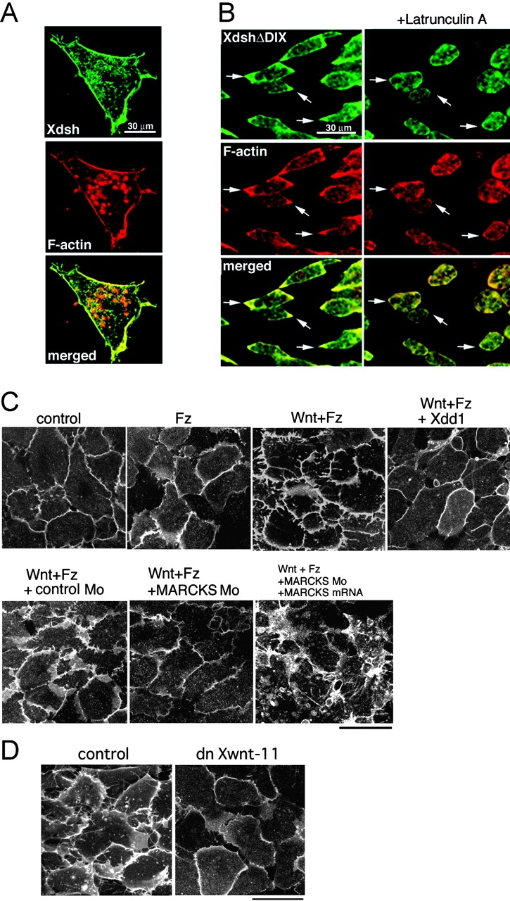 Figure 4. MARCKS is required for the cortical actin dynamics regulated by the noncanonical Wnt signaling pathway. (A) 250 pg of Xdsh-Venus mRNA was expressed in DMZ explants. Cells were dissociated and plated on an FN-coated dish. Xdsh-Venus was colocalized with the cortical actin. (B) 100 pg of XdshÎDIX-Venus mRNA was expressed in DMZ explants. The explants were cultured on an FN-coated dish. F-actin was probed with RMA. XdshÎDIX and RMA were colocalized (arrows). (Right) Treatment with 30 μM Latrunculin A for 30 min. (C) Xwnt11 and Xfz7 mRNAs (200 pg each) were coexpressed in animal cap explants with mb-RFP. The coexpression of Xwnt11 and Xfz7 promoted the protrusive activity. 5 pmol of MARCKS Mo and Xdd1 inhibited it. The effect of MARCKS Mo was rescued by coinjection of 200 pg of MARCKS mRNA. Bar, 50 μm. (D) mb-RFP was injected with or without mRNA encoding dominant-negative Xwnt-11 (2 ng). Bar, 50 μm.