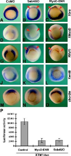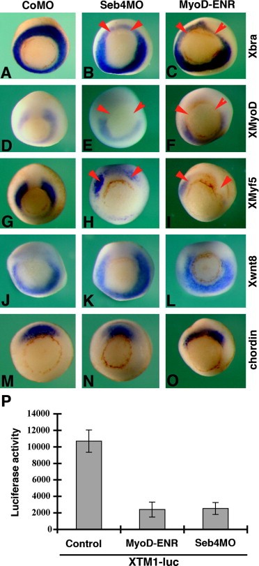 Fig. 3. Knockdown of Seb4 inhibits myogenic gene expression at the gastrula stage. Embryos at four-cell stage were injected in the dorso-lateral region with CoMO, Seb4MO or MyoD-ENR mRNA. In situ hybridization was performed at the early gastrula stage using probes indicated on the right side. Injection of CoMO (A) does not affect Xbra expression, while injection of Seb4MO (B) or MyoD-ENR mRNA (C) similarly inhibits, but does not completely block, Xbra expression. (D) Injection of CoMO has no effect on XMyoD expression, while both Seb4MO (E) and MyoD-ENR (F) inhibit XMyoD expression. (G) XMyf5 expression is not affected by CoMO, but Seb4MO (H) and MyoD-ENR (I) inhibit its expression. Xwnt8 expression is not affected by CoMO (J), Seb4MO (K) and MyoD-ENR (L). Similar chordin expression pattern in embryos injected with CoMO (M), Seb4MO (N) and MyoD-ENR mRNA (O). (P) Inhibition of the Myf5 promoter reporter (XTM1-luc) activity by Seb4MO and MyoD-ENR in stage 10.5 early gastrula. The luciferase reporter assay was performed in triplicates. Error bars indicate standard deviation.