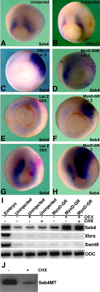 Fig. 1. (AâH) MyoD regulates the expression of Seb4 in whole embryos at different stages analyzed by in situ hybridization. (A and B) Expression of Seb4 (A) and XMyoD (B) in the lateralmesoderm of a stage 11 gastrula. (C) Overexpression of XMyoD induces ectopic Seb4 expression on the injected side of an early gastrula. (D) A dominant negative MyoD mutant, MyoD-ENR, blocks Seb4 expression. (E) Injection of Lac Z mRNA and treatment with DEX do not induce the expression of Seb4 in the early gastrula. (F) An early gastrula previously injected on one side with MyoD-GR and Lac Z mRNAs and treated with DEX for 1.5Â h shows ectopic expression of Seb4. (G) Injection of Lac Z mRNA and treatment with DEX for 1.5Â h do not induce ectopic Seb4 expression at stage 12. (H) Injection of MyoD-GR and Lac Z mRNAs and treatment with DEX for 1.5Â h strongly induce ectopic Seb4 expression at stage 12. (I) Induction of Seb4 expression in ectodermal explants by MyoD-GR in the absence of protein synthesis. Both uninjected and injected explants were treated with DEX or CHX, or both, for 1.5Â h. The expression of Seb4, Xbra and Xwnt8 was analyzed by RT-PCR. Seb4 expression is induced in explants injected with MyoD-GR mRNA and treated with DEX in the presence of CHX, while the expression of Xbra and Xwnt8 is not induced. ODC (ornithine decarboxylase) was used as a loading control. (J) Effect of CHX on the translation of injected Seb4MT mRNA.